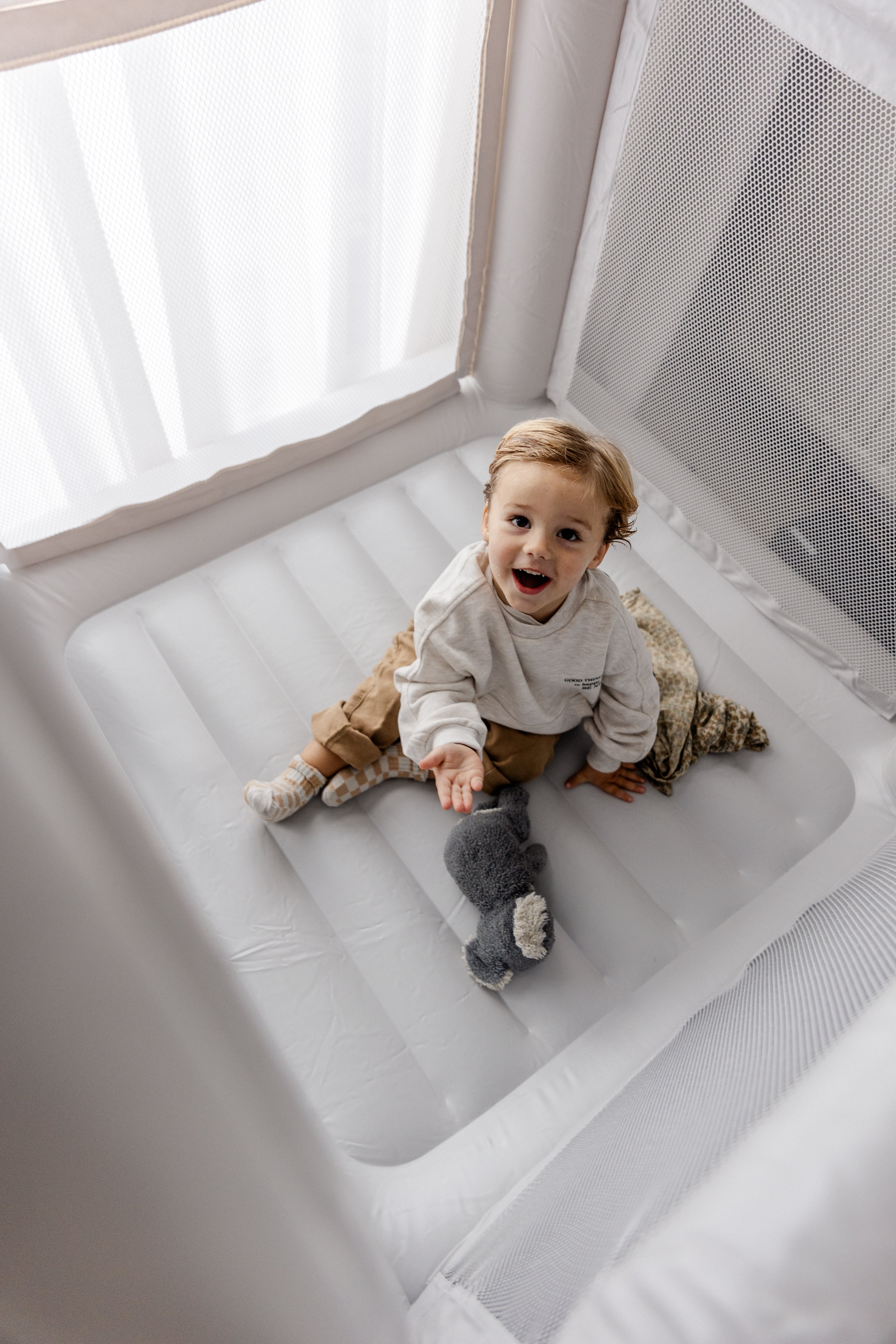 Review: "This is my favorite place to jump and to make a secret castle!" - Loïs. " We take this bouncy castle everywhere. It is so easy to set up and store. No iPad, but hours of healthy jumping. When it is quiet for a while, we know she is taking a nap. Completely safe and without much hassle. Top purchase!" - Mom of Loïs