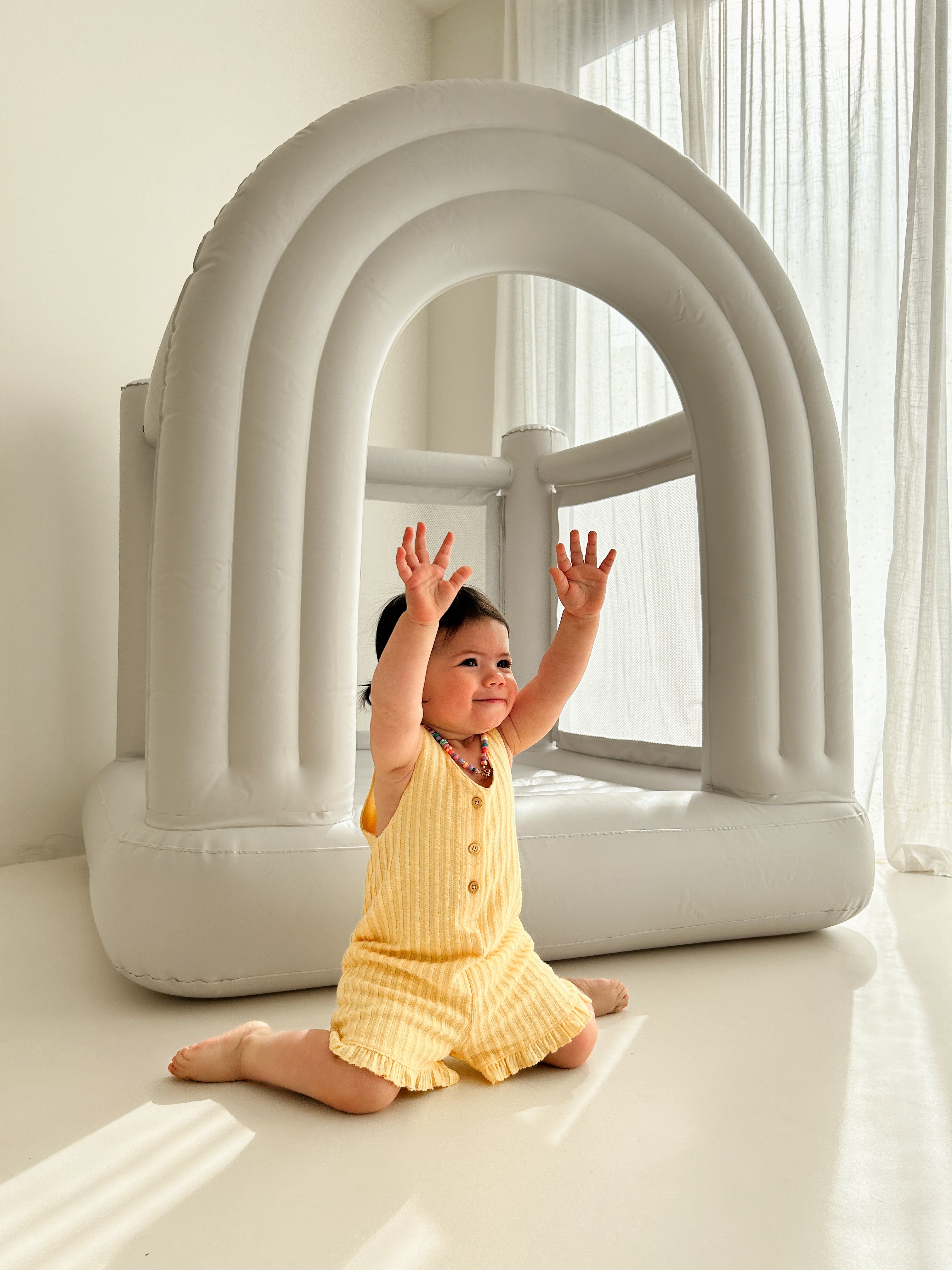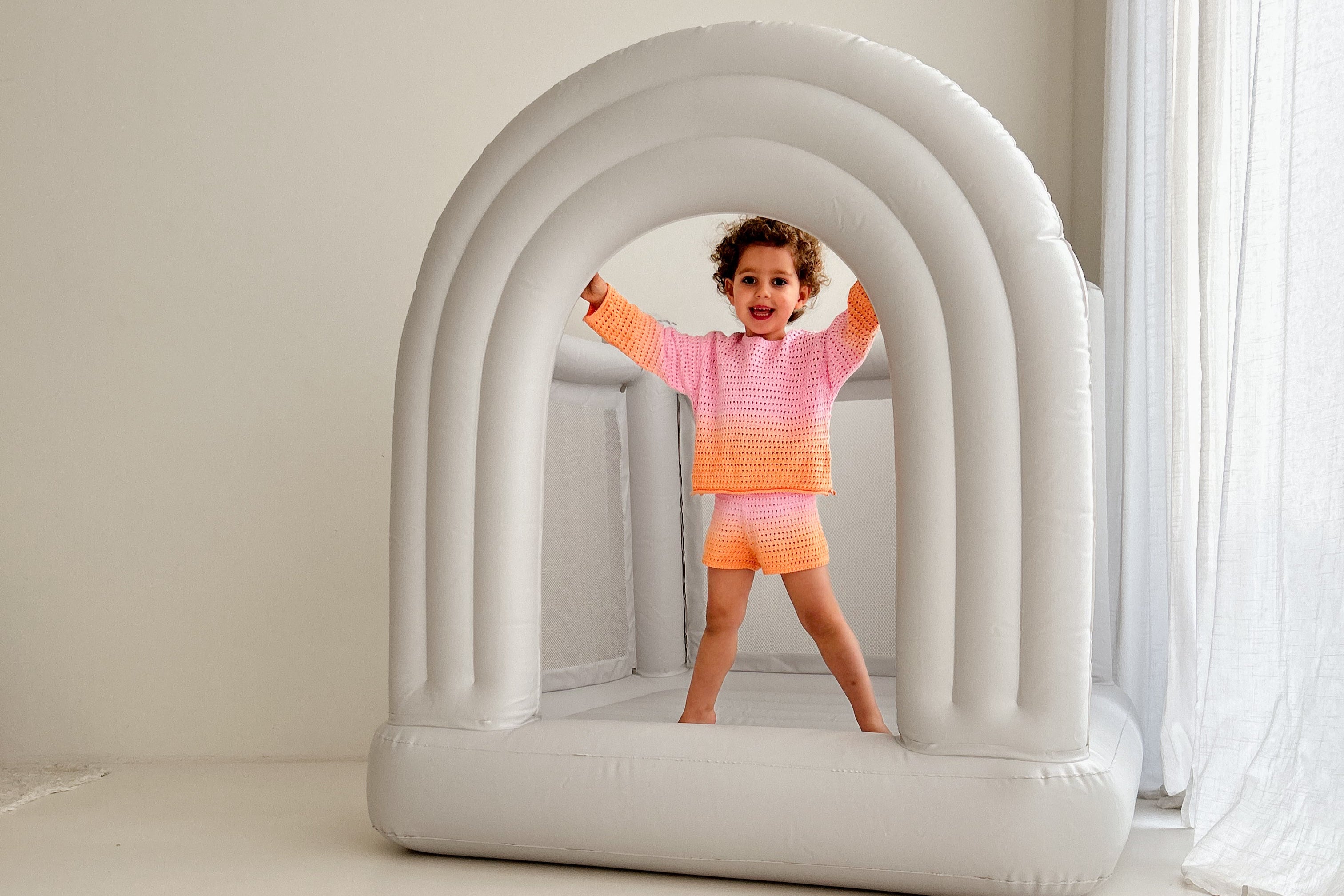 The Minii bouncy castle is inflated. No more cords or blowers. Your cutie can safely and silently jump or maybe even chill!